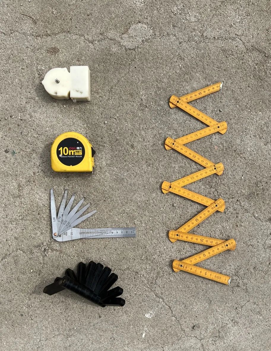 ►超高板、塞尺、钢卷尺、弦线、木折尺:超高板配合道尺测量超高或水平较大的线路;塞尺测量轨面、焊缝平直度以及轨缝等;钢卷尺用于测量长度;弦线用于测量轨向、高低;木折尺用于测量距离较短的长度。